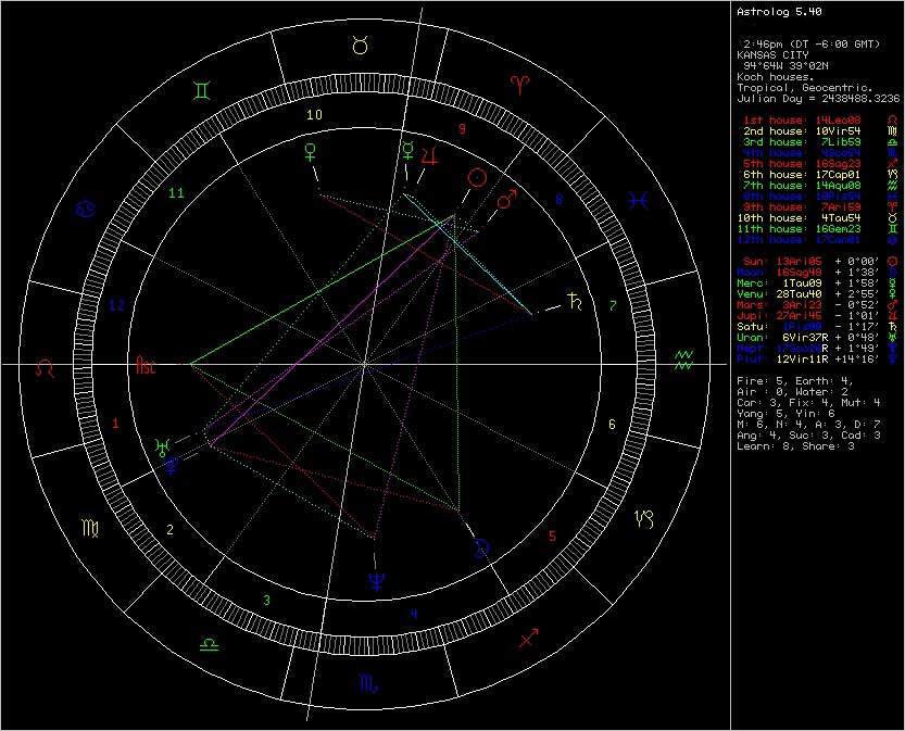 After downloading the software and unzipping it, launch the ap ASTROLOG. From the Info menu select set chart info. Enter your information and voila! If you're not an astrologer, it's not going to make sense, so print it out or save the settings as your birth day. You'll have something like this.